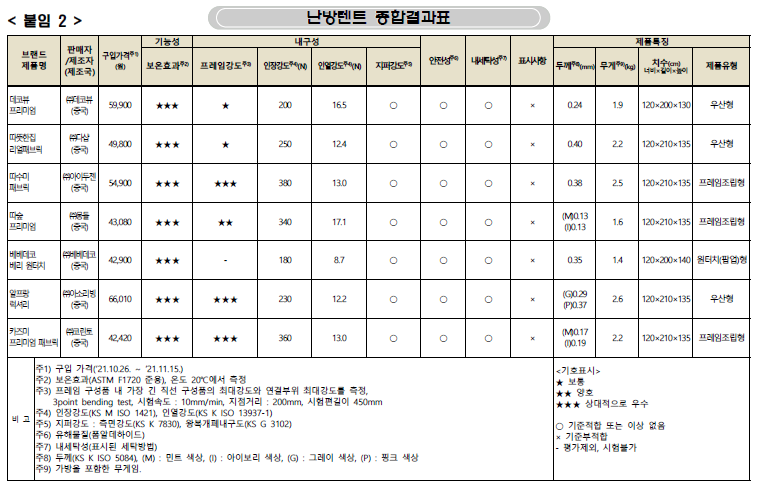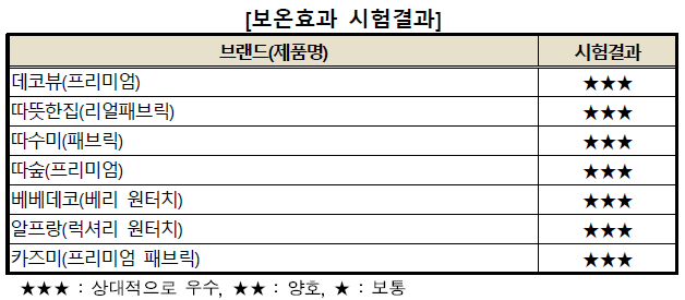 보온효과는 모든 제품이 우수했고,