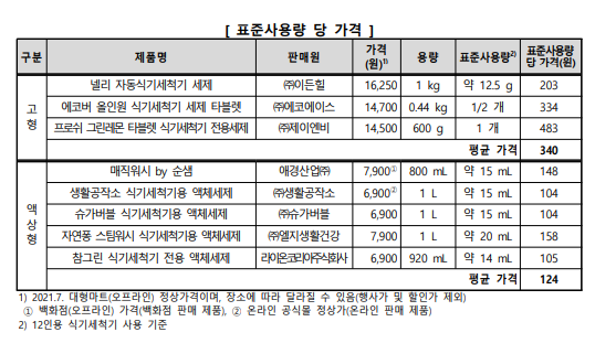 고형제품(평균 약 340원)이액상형제품(평균 약 124원)에 비해
