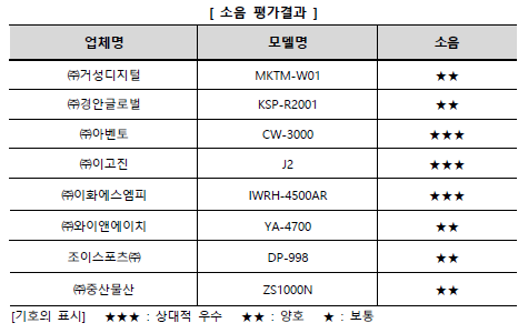 와이앤에이치(YA-4700), 중산물산(ZS1000N) 제품의 소음은 “양호”했고, 운동